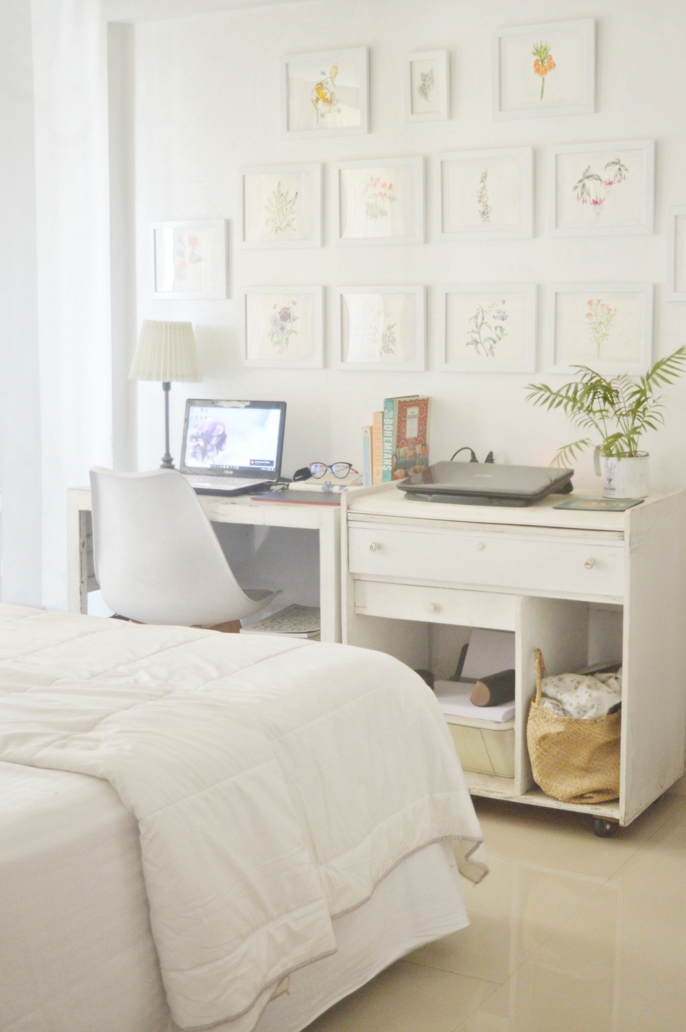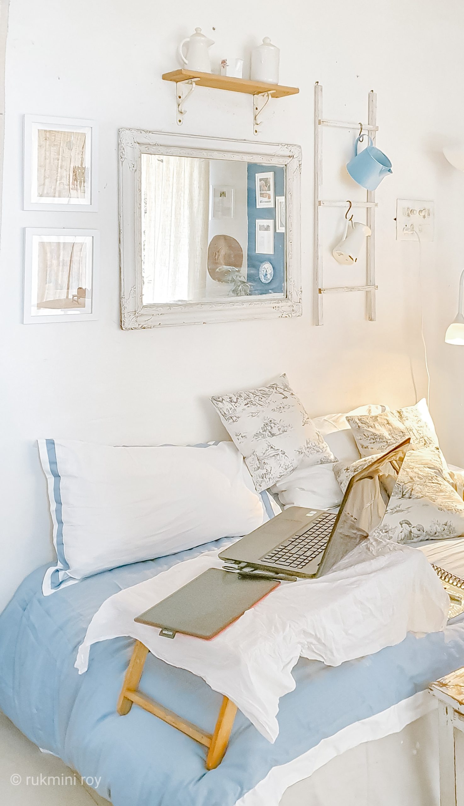 The bedroom wall home office: Have a wall? Then you have a workstation right there. Get a desk, double your dining room chair as your study chair and you are good to go. The ideal height for a table is 32″ and anything of that sort fits. Also, note the table on the left and one of the right. The laptop table here has no leg room while the other one does which makes two things easier.