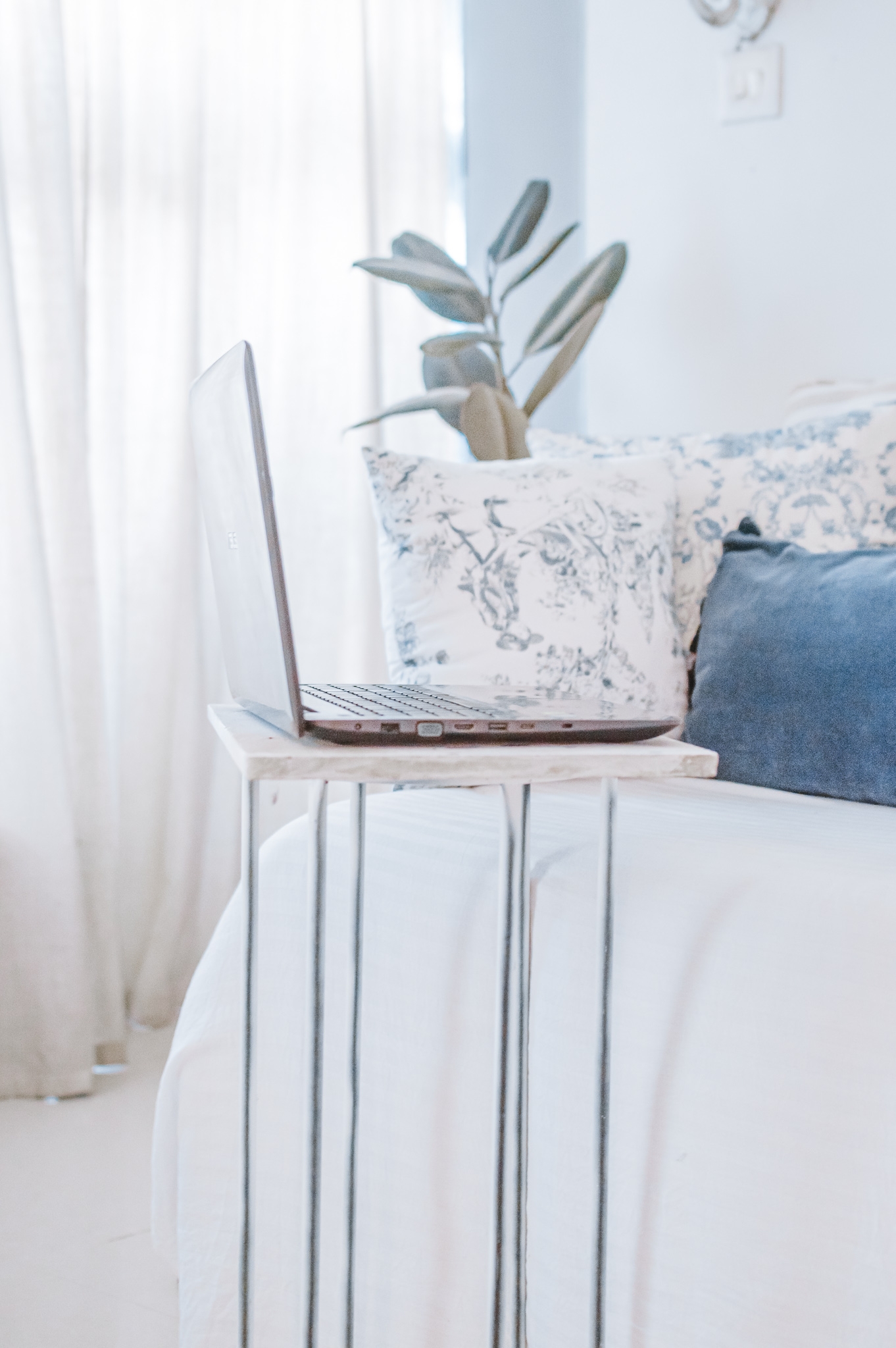 Need to quickly work from your bed? A plant stand or any stand and piece of wood will work just fine. Think of it, as your portable home office that you can literally take anywhere to!